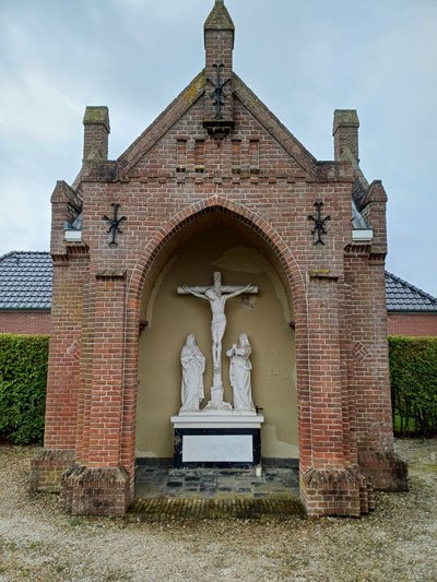 Tegen de achterwand staat de kruisiging, bestaand uit drie beelden die de gekruisigde Christus met links de moeder Maria en rechts de apostel Johannes voorstellen. Onderaan het kruis bevinden zich neergaande wortels die het leven symboliseren. De calvariegroep staat op een tombe die het graf na de kruisafname voorstelt. Aan de oostkant van het gebouwtje bevindt zich een dichtgemetselde deur; aan de westzijde de ingang tot het baarhuisje. Rechts van de calvariekapel ligt het graf van pastoor W. H. Veling Smale – hij was van 1871 tot 1918 pastoor Op Den Hoorn – en van zijn broer Cornelius Smale.